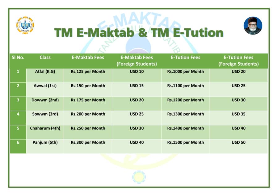Monthly FEEs chart 📚 TM E-TUITION FEE Atfal Fee: ₹ 1000/- Per Month Pay Fee Awwal Fee: ₹ 1100/- Per Month Pay Fee Dowwum Fee: ₹ 1200/- Per Month Pay Fee Sewwum Fee: ₹ 1300/- Per Month Pay Fee Chaharum Fee: ₹ 1400/- Per Month Pay Fee Panjum Fee: ₹ 1500/- Per Month Pay Fee Pay Now (Foreign Students) Title of the document Tanzeemul Makatib se Madad Lijiye Tanzeemul Makatib ki Madad Kijiye